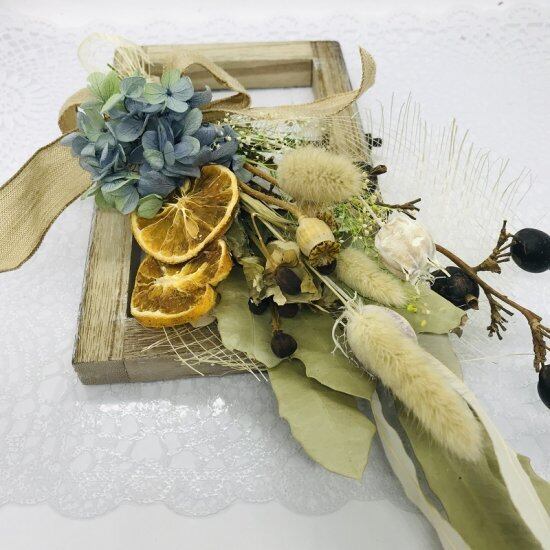 ウッドフレームにドライフラワーのスワッグでデコレート。
