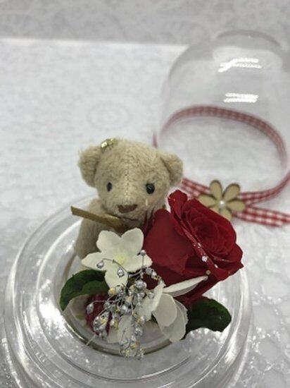 手のひらサイズの小さなドームの中で、可愛いベアーがプリザーブドフラワーの花束を抱えています。