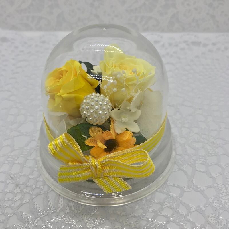 手のひらサイズの小さなドームの中に、プリザーブドフラワーを詰め込んでいます。