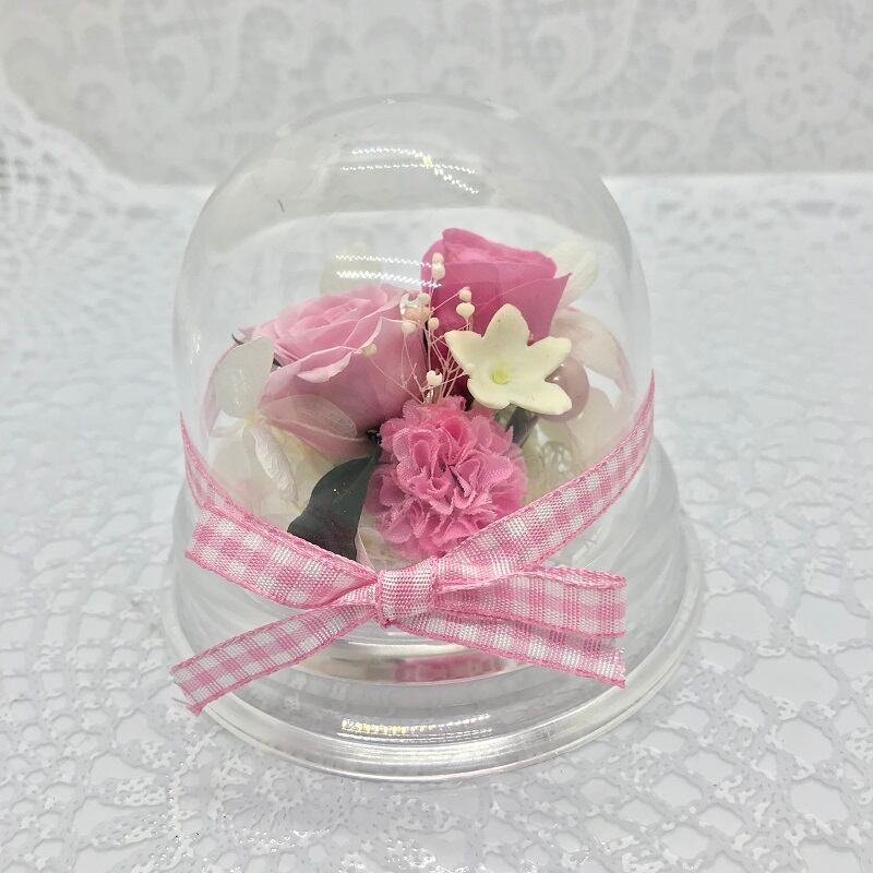 手のひらサイズの小さなドームの中に、プリザーブドフラワーを詰め込んでいます。